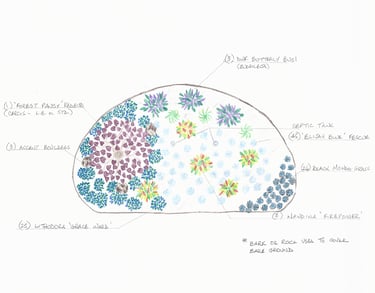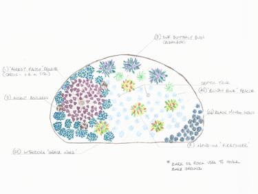 Gathering Place with Water Feature, Seating around a fire feature and hidden paths for grandchildren taking them to a large scale checkerboard and culminating at an enticing Fairy Village.